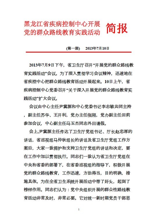 黑龙江省疾病控制中心开展党的群众路线教育实践活动简报 时间:2013-07-18 来源:党办 分享到: QQ空间 新浪微博 腾讯微博 微信 更多 相关信息: 省疾病预防控制中心举办“三八”妇女节 女性健康科普知识讲座 2026-03-06 省疾控中心党委部署开展树立和践行正确政绩观学习教育 2026-03-04 省疾控中心党委召开2025年度民主生活会 2026-02-10