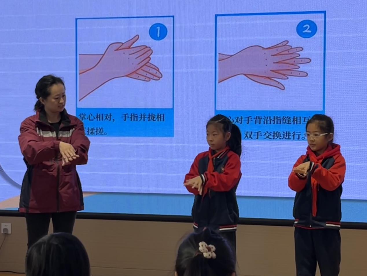 随后,黑龙江省疾病预防控制中心环境所工作人员韩戴欣示范并讲解了七步洗手法。学生们神情专注,认真学习。
