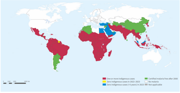 世界卫生组织(WHO)于2024年12月11日发布的《2024年世界疟疾报告》显示:2023年,全球83个国家估计有2.63亿例疟疾病例和59.7万例疟疾死亡。全世界有将近半数人口面临疟疾风险。虽然撒哈拉以南非洲在全球疟疾负担中所占比例畸高,但世卫组织东南亚和东地中海、西太平洋和美洲区域也有大量病例报告。