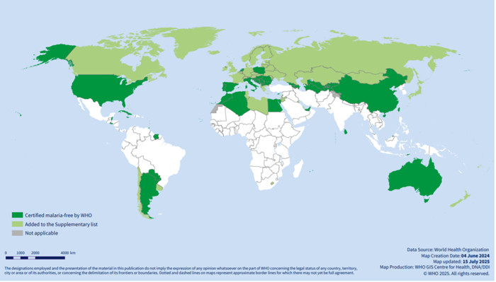 (WHO发布的消除疟疾地图(截至2025年7月15)